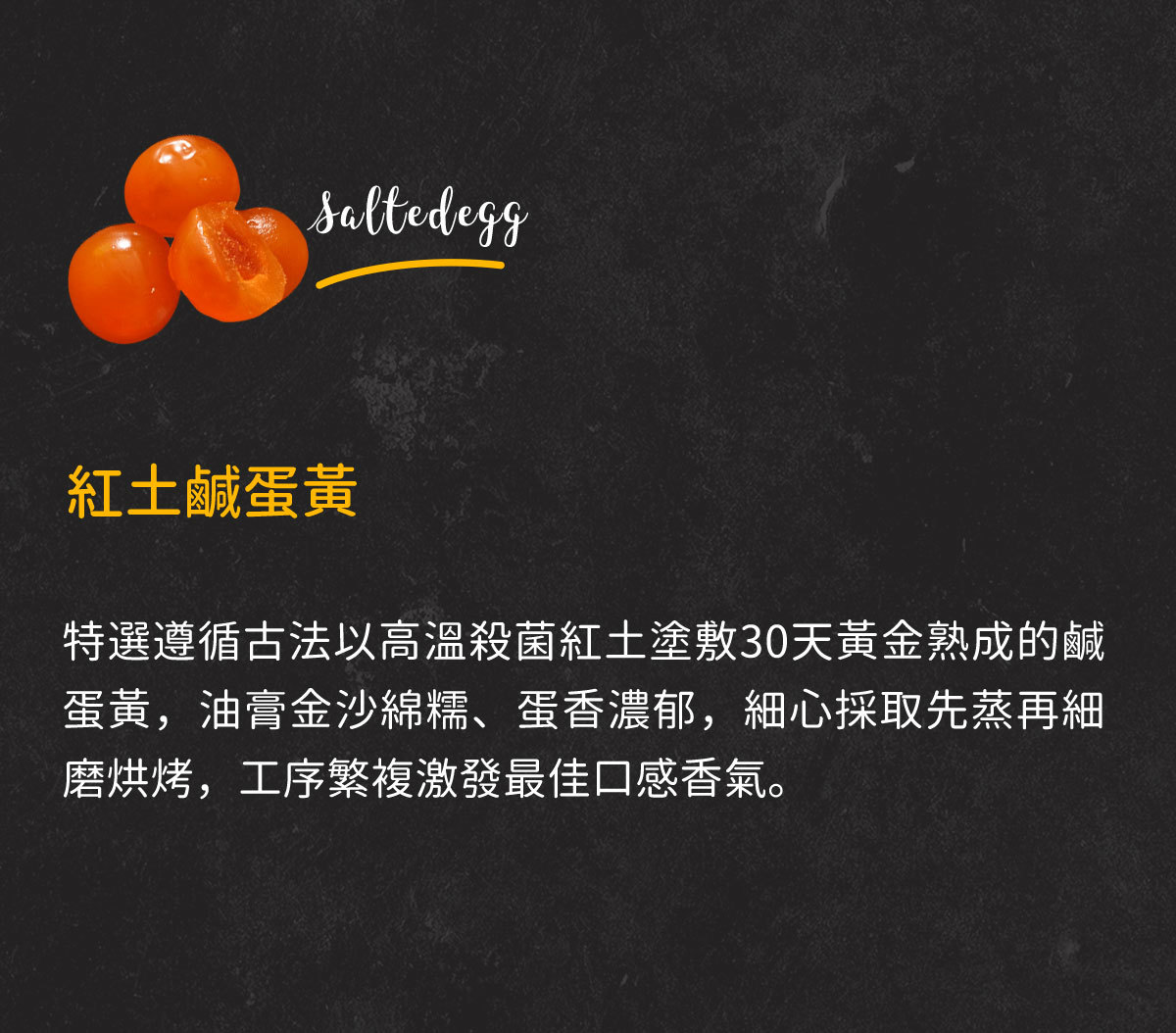 古法製作的紅土鹹蛋黃,打碎後拌入奶油乳酪,凝聚東西方的香氣,香滑的濃郁甜鹹口感,每一口都是絕佳風味。