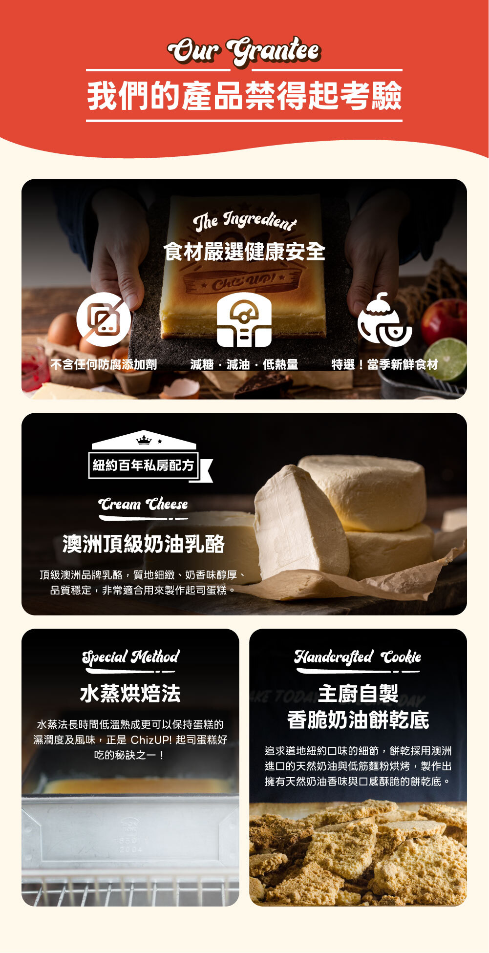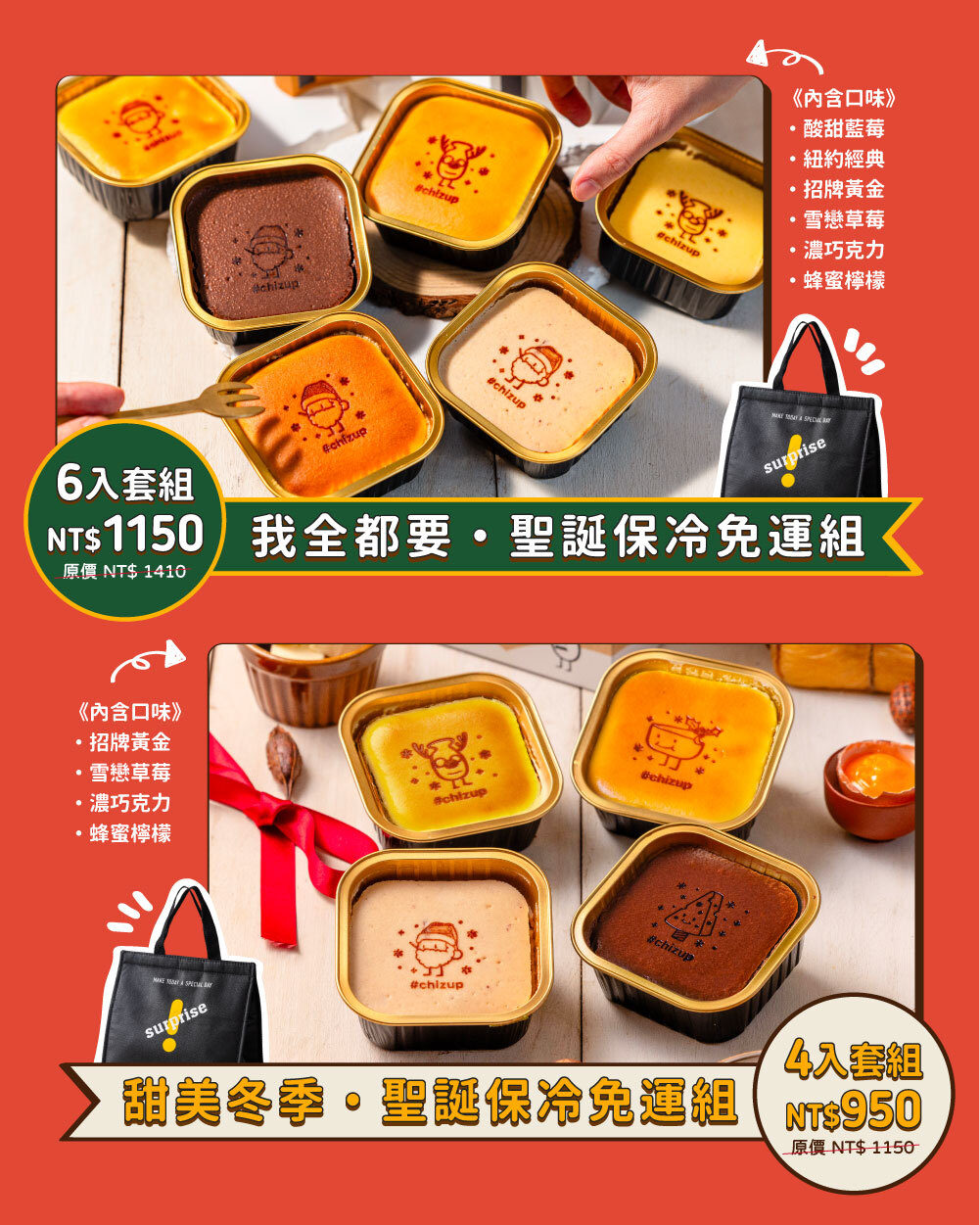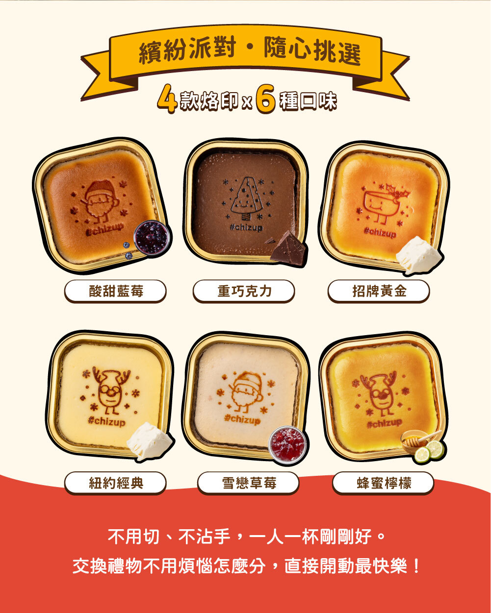 純正美式配方重乳酪基底,口感濃郁紮實帶點微酸,每一口都衝擊味蕾,推薦給喜歡重乳酪的朋友。搭配台灣當季手工熬煮草莓醬、譽為「此生必吃」的單一莊園苦甜巧克力、香濃蜂蜜檸檬,每種口味都充滿個性,香氣逼人,宛如舌尖上的一場磅礡交響樂。更有免運套組