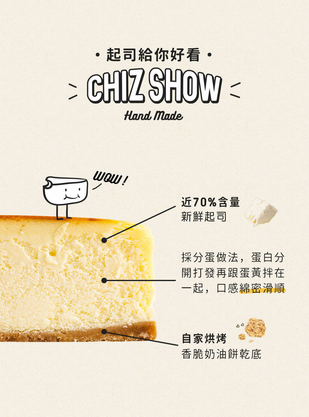 招牌黃金起司-黃金比例的乳酪配方,嚴選天然食材,繁複手工分蛋製作及水浴烘焙法,提昇綿密滑順口感,金黃色的外表下,蘊藏著深不可測的濃郁起司風味