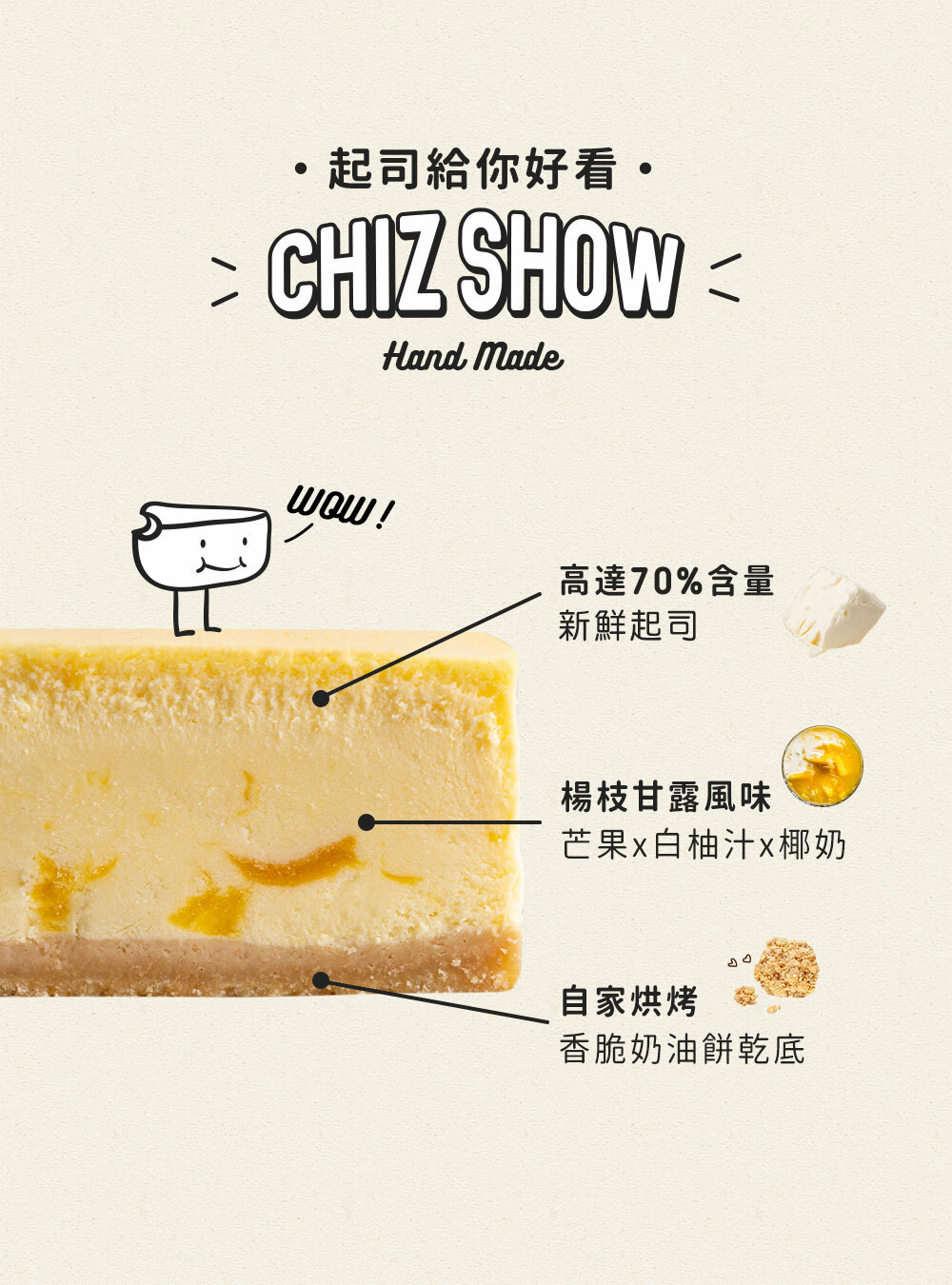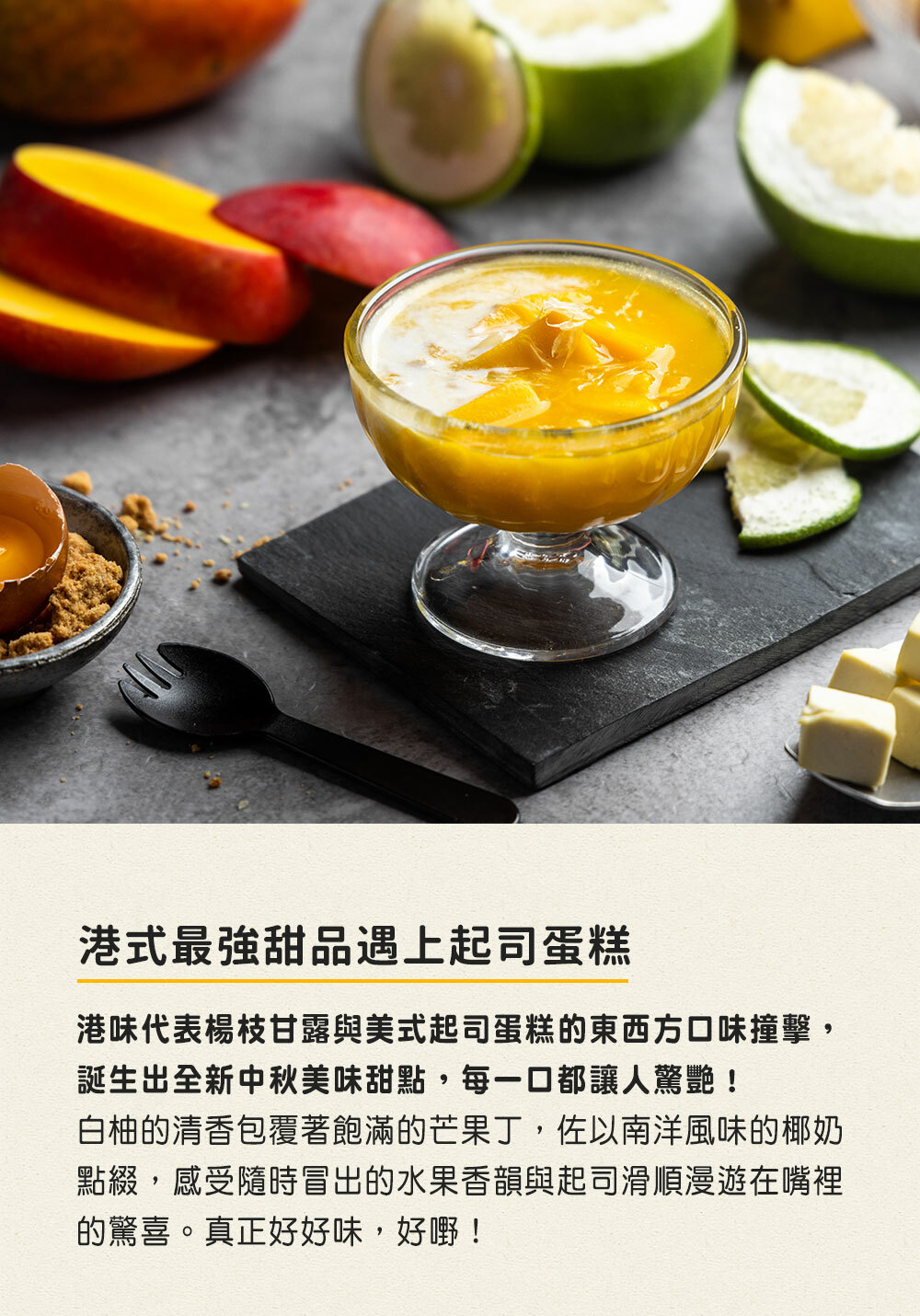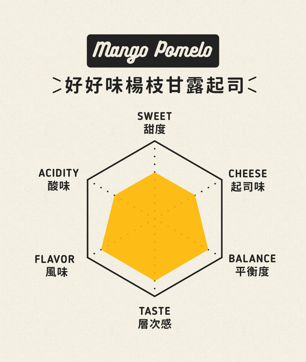 白柚的清香包覆著飽滿的芒果丁,佐以南洋風味的椰奶點綴,感受隨時冒出的水果香韻與起司滑順漫遊在嘴裡的驚喜。真正好好味,好嘢!