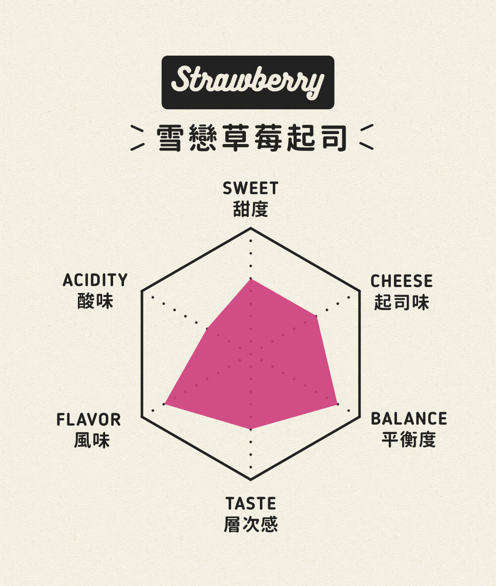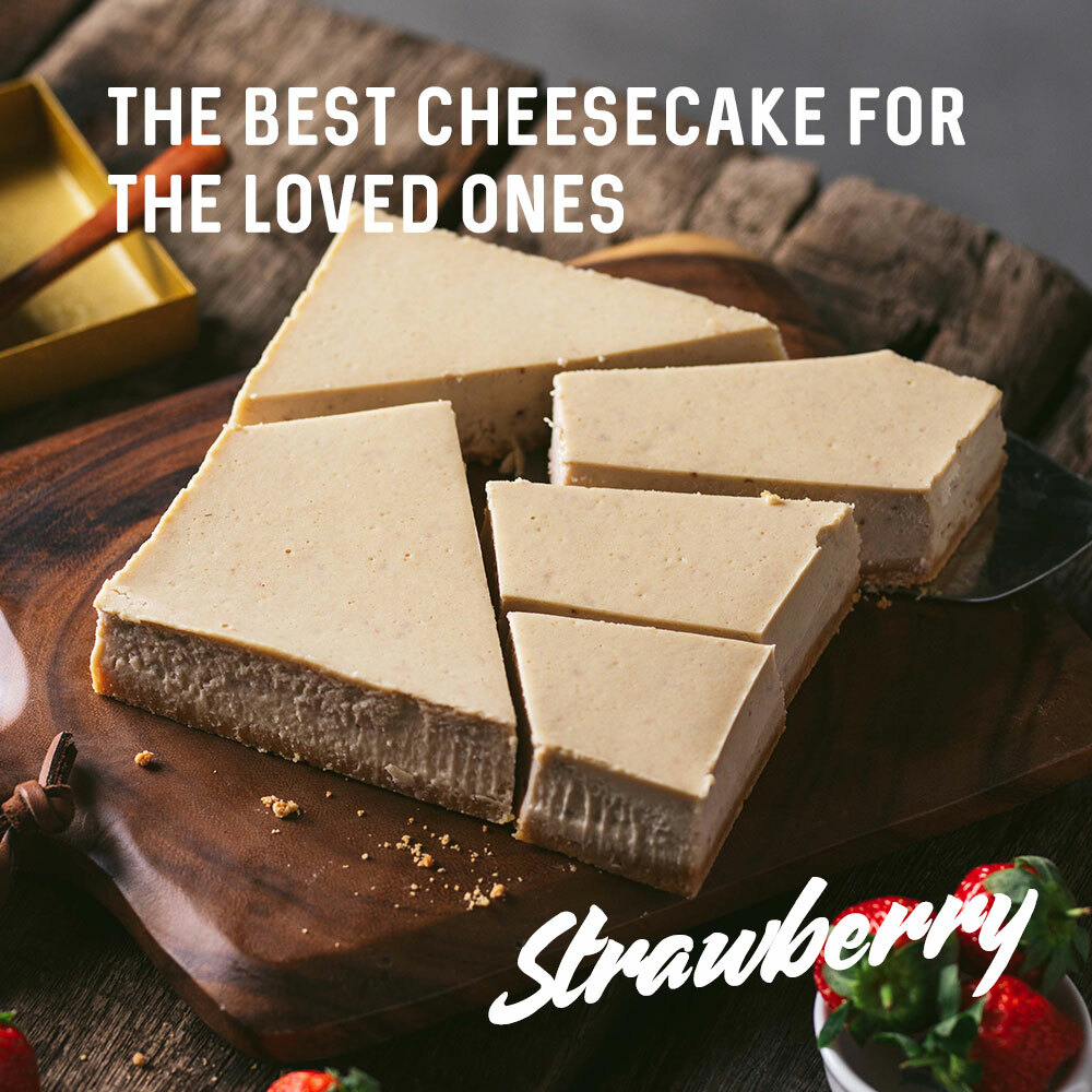 精選台灣在地草莓,用慢火熬成漂浮微軟草莓顆粒的草莓醬,豪華地拌入特製濃郁起司,進爐烘烤後的起司蛋糕覆蓋著滿滿莓果香氣。