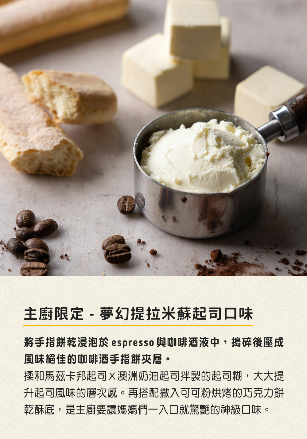 嚴選天然食材,多層次夢幻神級口味,馬茲卡邦起司與奶油起司完美結合,手指餅乾浸泡咖啡酒佐可可巧克力餅乾底,口感濕潤綿密、甜度適中。