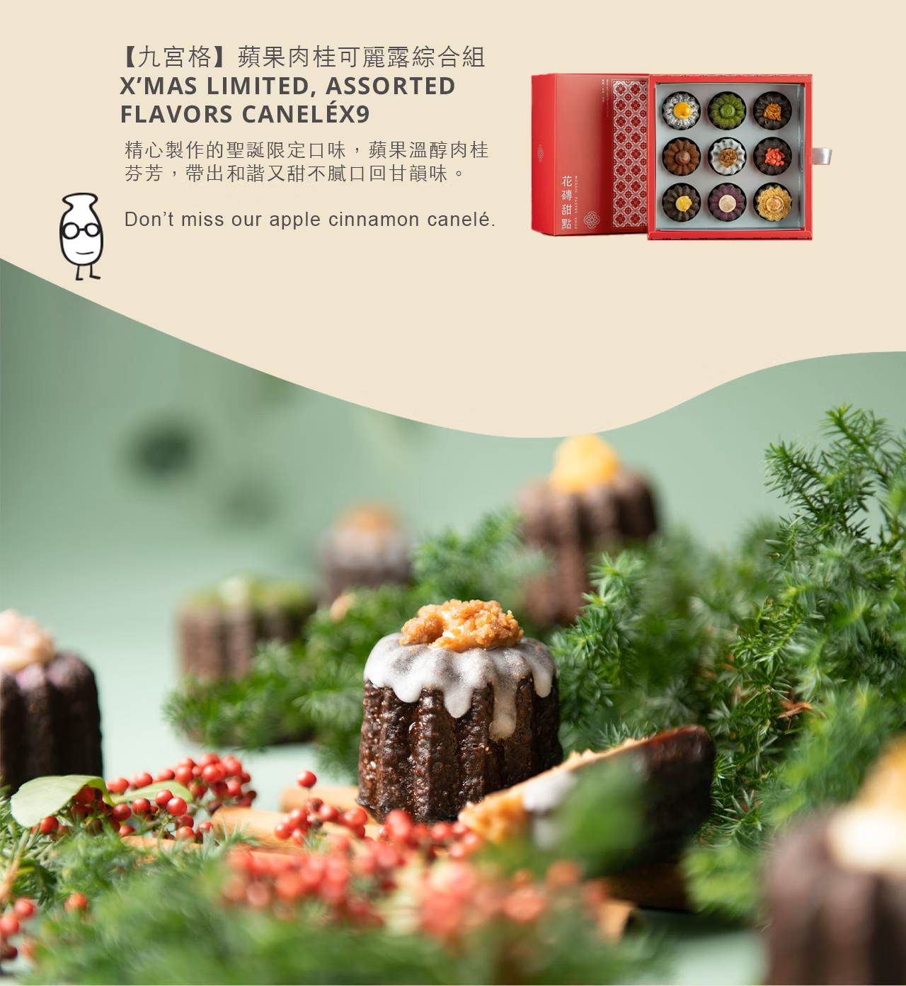 2.蘋果肉桂可麗露組 1 盒 各一顆!期間限定-聖誕綜合可麗露禮盒 涵蓋口味:蘋果肉桂,巧克力,焦糖,抹茶,草莓,檸檬,芋頭,百香果,花生各一,每一顆都是驚喜! 蘋果肉桂可麗露登場!精心製作的聖誕限定口味,和諧帶出甜不膩口的回甘韻味,巧以黑糖脆脆點綴,讓您於品嚐口感之後,還能感受溫醇香氣與甘甜滋味的合奏。