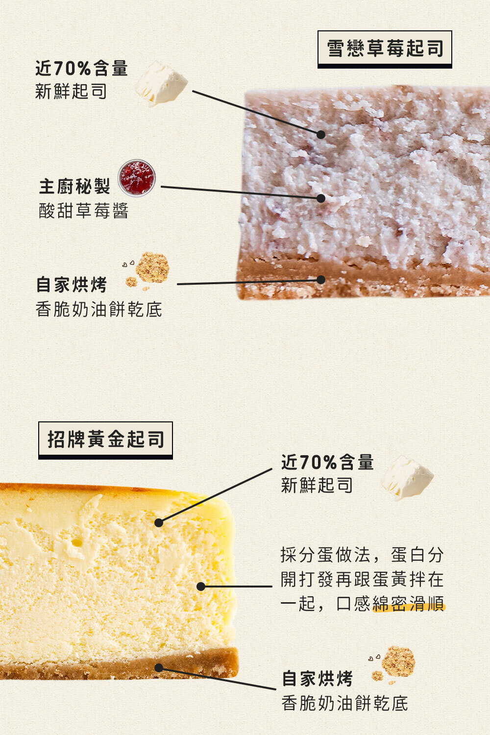 ⊛黃金比例的乳酪配方,嚴選天然食材,繁複手工分蛋製作及水浴烘焙法,提昇綿密滑順口感,金黃色的外表下,蘊藏著深不可測的濃郁起司風味。